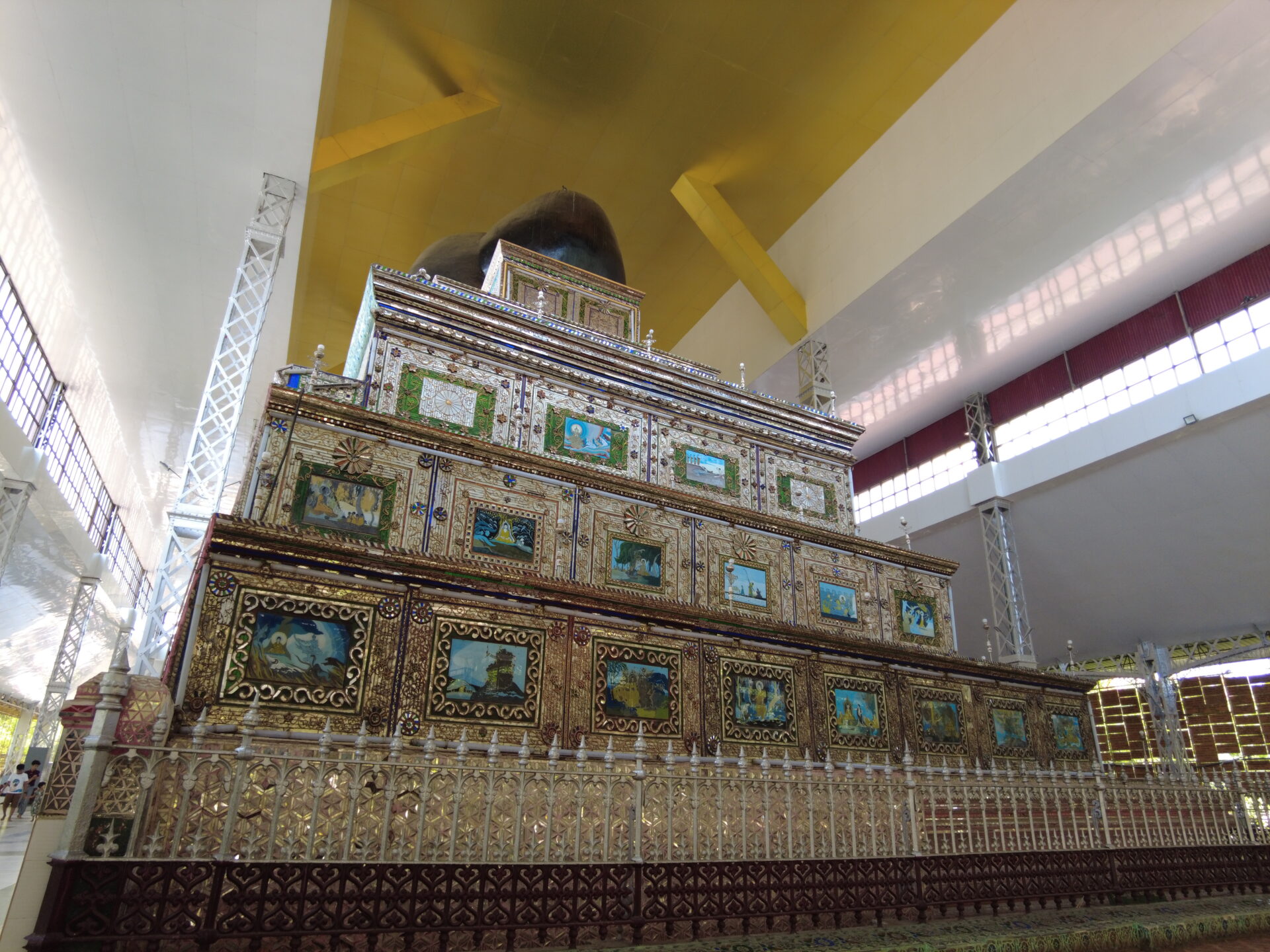 シュエターリャウン寝仏は994年にモン族のミガディパ王によって建てられたとされ、全長55m、高さは16mあるミャンマー最古の寝仏と伝わります。背面の台座には、これまでの歴史が描かれています。